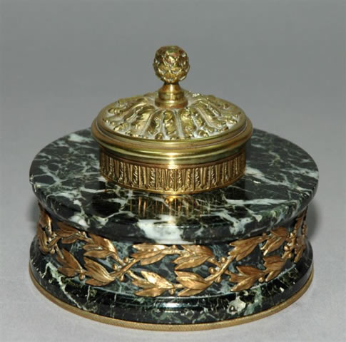 ENCRIER N III en BRONZE DORÉ sur une base cylindrique en marbre campan vert. Avec une frise couronne de laurier. Au centre le godet encrier rond à décor floral sous couvercle charnière.