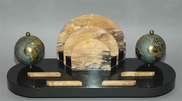 ÉCRITOIRE Art Déco, dont range lettres en marbre campan ocre rosé sur une base plateau plumier en marbre noir. Les deux porte godets encriers sont deux mappemondes en BRONZE DORÉ et patine grise pour les godets encriers sous couvercle charnière à prise bouton.