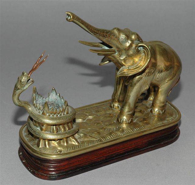 ENCRIER en BRONZE DORÉ à sujet animalier d'un éléphant effrayé par un serpent enroulé d'une vieille souche d'arbre creuse, sur une base en acajou. Le godet encrier est inséré dans la souche.