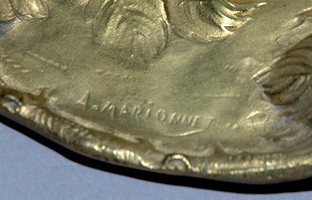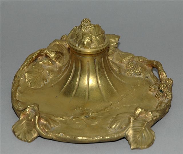 ENCRIER en BRONZE DORÉ par A. MARIONNET, le décor Art Nouveau est au mûrier, feuillage et fruits. De forme circulaire le plateau plumier présente un porte-godet pour un godet en cristal, sous couvercle charnière.