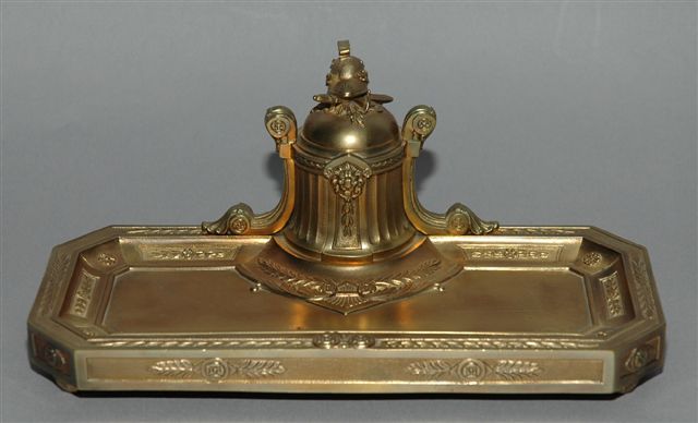 ENCRIER en BRONZE DORÉ à la symbolique militaire par les attributs du vainqueurs (rubans, épée, lauriers, casque) sur le couvercle du porte godet pour un godet encrier cristal sous couvercle charnière en arrière et au centre d'un plateau plumier de forme rectangulaire aux coins coupés.