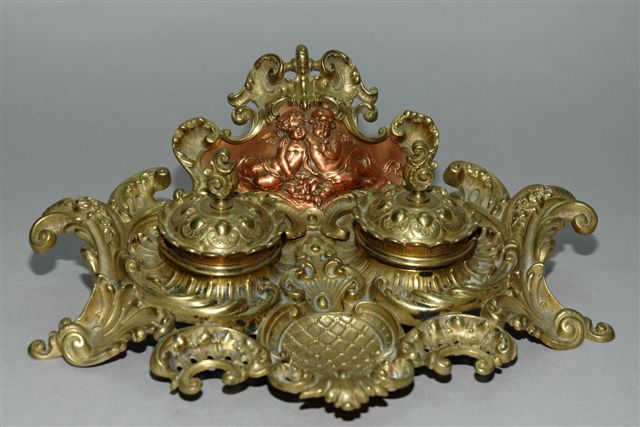 ÉCRITOIRE en BRONZE DORÉ, de forme rocaille avec en plateau un plumier à décor de coquilles, feuilles d'acanthe, de palmettes et un dosseret avec au centre un médaillon de cuivre rouge au décor symbolisant l'amour par des putti enlacés. De chaque côté, les deux porte godets sont à couvercles charnières.