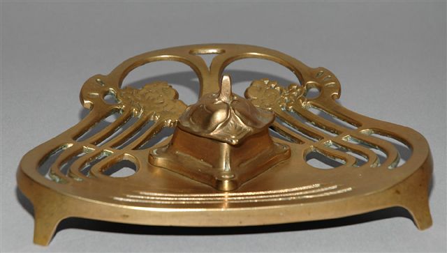 ENCRIER Art Nouveau en BRONZE cuivré à décor ajouré et motifs floraux, (attribué à MAJORELLE) au centre sous le couvercle floral un godet encrier.
