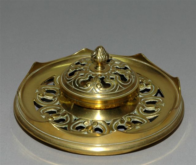 ENCRIER Art Déco sur base et coupelle ajourées en BRONZE DORÉ.