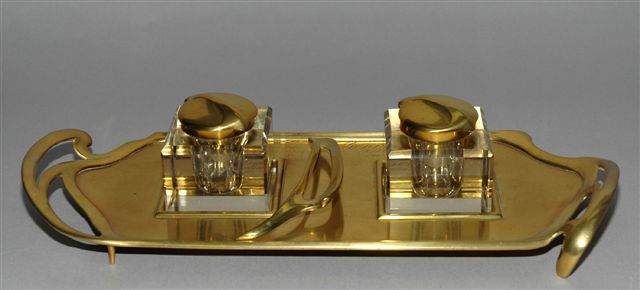 ÉCRITOIRE Art Nouveau en LAITON DORÉ pour deux encriers cubiques en cristal à couvercle charnière sur plateau rectangulaire ansé et portant au centre une griffe repose plume.
