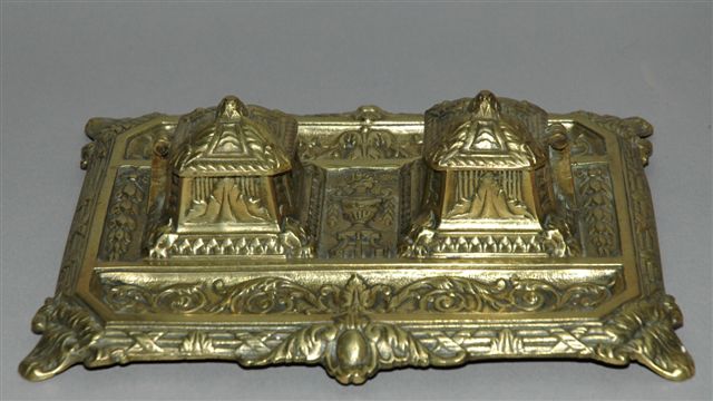 ENCRIER en BRONZE DORÉ de style Renaissance avec un plateau plumier, rectangulaire et deux porte godets encriers à couvercle charnière. Décor floral. Marqué au revers BD 15.