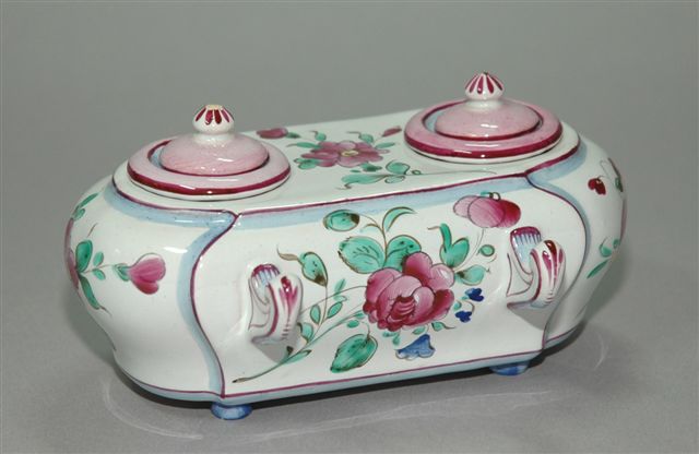 ENCRIER de forme ovoïde pour deux encriers couverts et ergots repose plume sur le flan. Décor roses mousses sur couverte blanche et liseré pourpre.