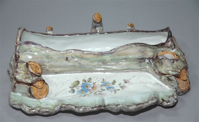 ÉCRITOIRE fantaisiste en tronc couché et deux départs de branches abrite l'un le godet encrier, l'autre un poudreur. Le tronc évidé sert de rangement. Les branchages du dosseret font repose plume. A l'avant une partie plumier est à décor de fleurs.