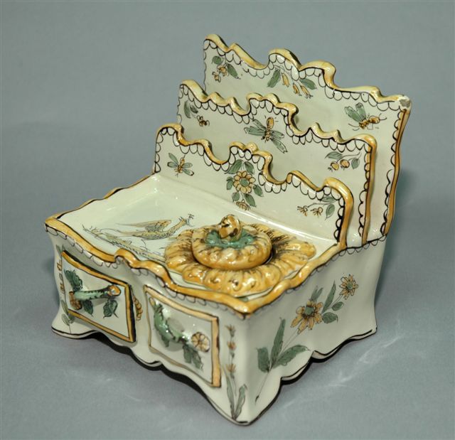 ENCRIER à dosseret classeur et repose plume représentant un fourneau ou buffet. Le godet encrier couvert est une fleur et sur l'avant un petit tiroir sert de rangement. Le décor est fait de fleurs et d'insectes et d'un volatile dans les tons vert et ocre sur couverte crème.