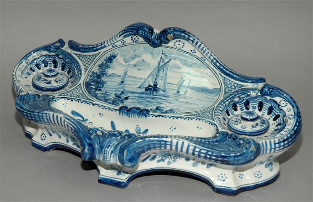ÉCRITOIRE rocaille à décor de Delft en camaïeu de bleu à fleurettes dans le fond de la partie plumier et d'une marine aux voiliers pour le médaillon central. Il offre deux godets encriers couverts. NS, attribué à LUNEVILLE / SAINT-CLÉMENT, circa 1900-1930.