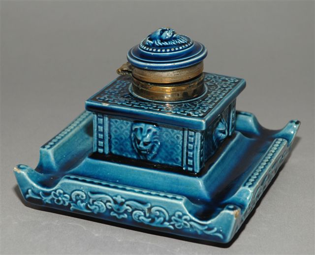 ENCRIER simple flacon à forme d'urne cubique à couvercle serti par un double anneau charnière laiton, posée au centre d'un petit plateau carré en majolique bleu ombré à décor floral de croisillons et de quatre mascarons en tête de lion. NS, il porte le n° de modèle 2835 au catalogue de SARREGUEMINES.