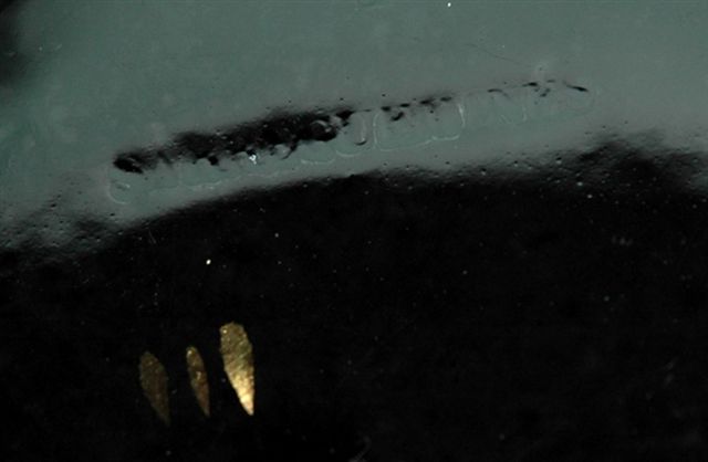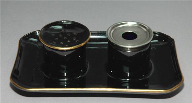 ÉCRITOIRE en plateau plumier portant deux porte godets, pour un encrier en cristal et argent et un poudrier. Modèle en majolique noire à liseré or. Au revers elle porte la marque en creux SARREGUEMINES.