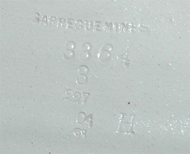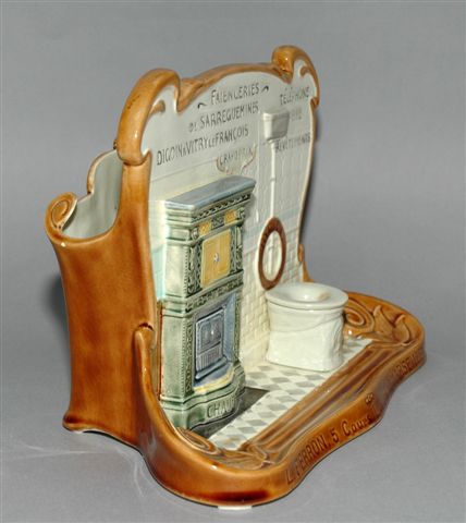 ÉCRITOIRE avec plumier, encrier et range lettres à but publicitaire pour les FAÏENCERIES de SARREGUEMINES à l'usage et au nom de leurs dépositaires revendeurs. Cet exemplaire est au nom de L. FERRON à Marseille. Outil de communication par excellence il présente la palette des productions de Sarreguemines: éléments d'architecture, chauffage, carrelage de sol et revêtements muraux, sanitaires dont la cuvette sert d'encrier. Marque rectiligne en creux SARREGUEMINES.