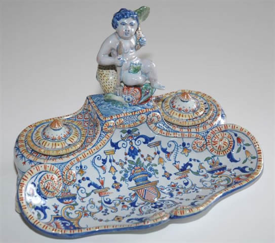 ÉCRITOIRE rocaille modèle au Neptune. Deux godets encriers couverts en arrière du plateau plumier, à décor de Rouen.