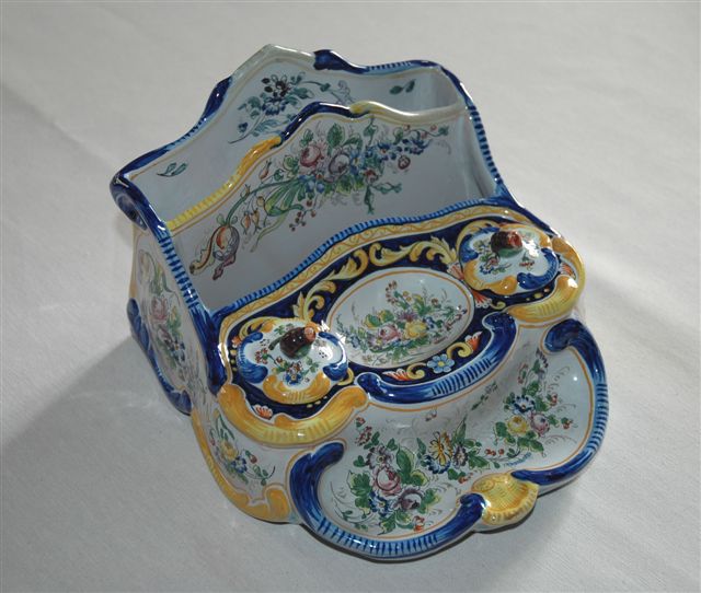 ÉCRITOIRE range lettres à deux rangements à l'arrière de la partie centrale qui porte deux godets encriers couverts surmontant un plumier de forme coquille. Le décor est floral de bouquets et guirlandes.
