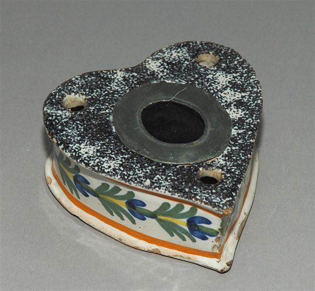 AUXERROIS / NIVERNAIS, 18ème, ENCRIER en forme cur, décor de guirlandes sur le pourtour et à l'éponge sur le dessus, pour un godet encrier en étain et trois trous pique plume.