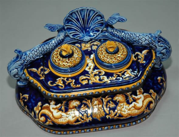 ÉCRITOIRE Dauphins pour deux godets encriers couverts, décor italien n° 28 sur fond bleu.