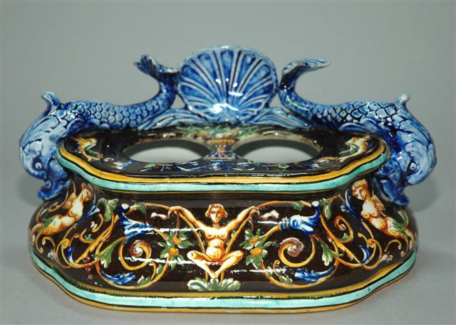 ÉCRITOIRE Dauphins pour deux godets encriers couverts, décor italien sur fond brun/noir, au sujet de nu féminin. (absence encriers et bouchons).