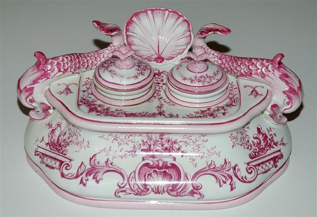 ÉCRITOIRE Dauphins pour deux godets encriers couverts, décor pourpre de Saxe.