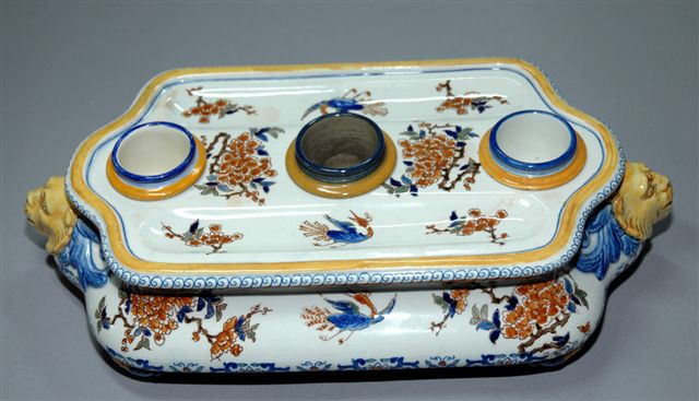 ÉCRITOIRE "Têtes de lion" pour trois godets encriers couverts, décor japonisant. (absence des bouchons).