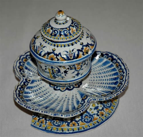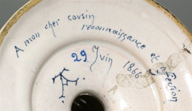 ENCRIER réalisé par A. Thibault alors décorateur dans l'atelier Blésois de ULYSSE BERNARD. La pièce porte au revers une dédicace pour accompagner le cadeau qu'il en fit à son cousin l'Abbé Pally qui lui avait trouvé cette place: "A mon cher cousin reconnaissance et affection 29 juin 1866". L'encrier qui a la forme d'une urne couverte sur un plateau fait de trois coquilles posé sur un piédouche est traité dans un décor de Rouen avec palmettes et rinceaux.