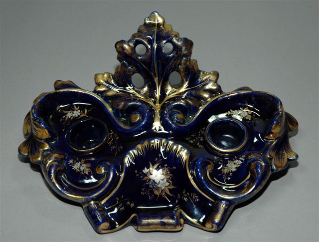 ÉCRITOIRE rocaille pour deux encriers couverts. Le décor en bleu de Tours aux motifs de fleurs et rehauts or.