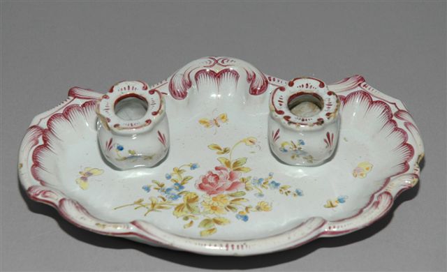 ENCRIER forme coquille ovale à décor floral dans la partie plumier à marli peigné pourpre pour deux godets encriers.