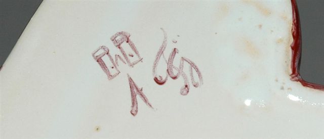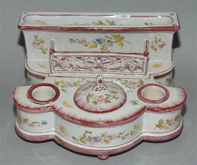 Le décor de fleurs isolées ou en guirlandes orne toutes les faces de cette pièce dont les arêtes et bordures sont soulignées d'un trait ou d'un peigné pourpre. La partie basse offre deux godets encriers à liseré pourpre de part et d'autre d'un réceptacle de rangement sous bouchon à prise bouton.