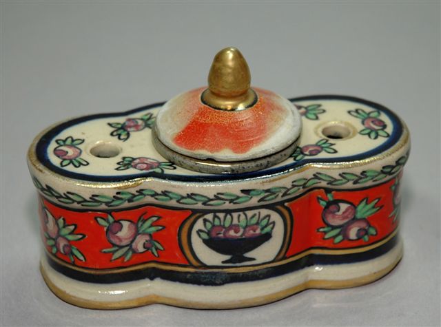 ENCRIER en " grès de Renoleau " forme ovale pour un godet encrier à bouchon entre deux trous pique plume. Le décor dit " de La Marquise de Sévigné ".