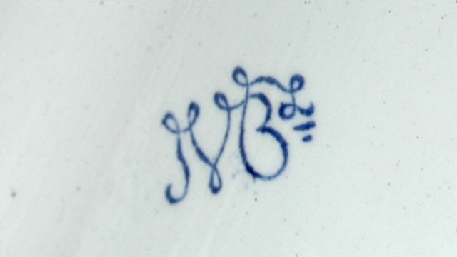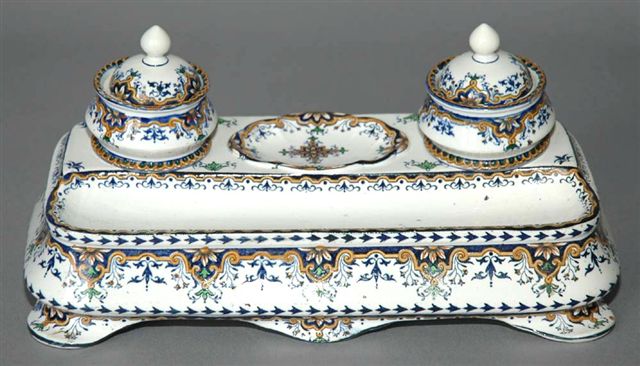 ÉCRITOIRE de forme fourneau reposant sur quatre pieds galbés pour deux godets encriers couverts en arrière d'une rigole plumier. Le décor de Rouen aux lambrequins dans des tons de bleu et ocre. Signature cursive encrée bleue: JVBX pour J. VEILLARD BORDEAUX, circa 1850.