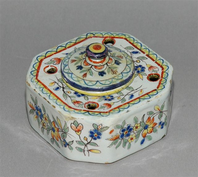 ENCRIER forme octogonale à décor floral pour un godet encrier et son bouchon.