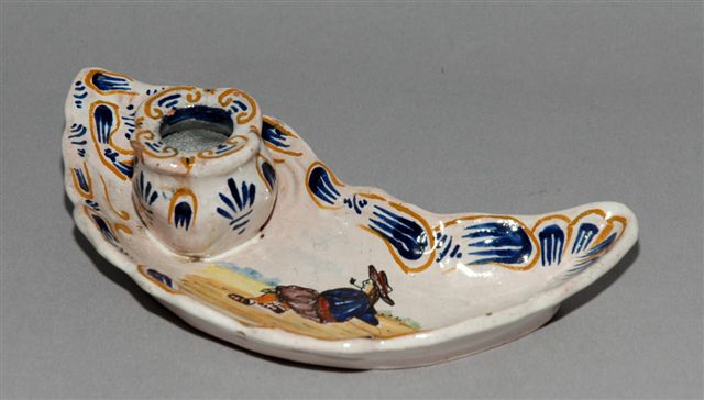 ENCRIER forme huître à décor d'un breton au repos dans la partie plumier à marli peigné bleu et jaune pour un godet encrier.