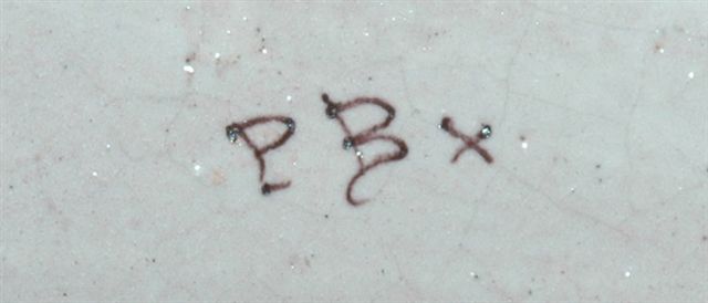 Faïences de MALICORNE, marque (encrée bleue) PBx pour POUPLARD-BEATRIX avant 1897 date d'un arrêté de justice ordonnant la destruction de toute la production litigieuse avec Porquier-Beau: circa 1875 - 1897.