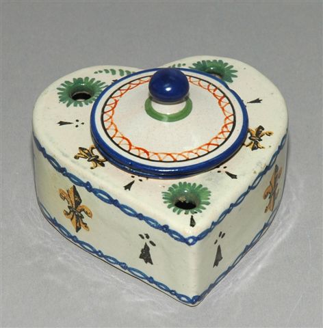 ENCRIER forme cur pour un godet et trois trous pique plume le décor est à motifs des symboles bretons de moucheture d'hermine et de fleurs de lis or, les arêtes sont soulignées d'une frise bleue.