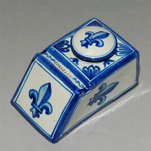 ENCRIER forme petit pupitre pour un godet avec son bouchon et encoche repose plume portant l'inscription Josselin, le décor est à motifs fleurs de lis en bleu, les arêtes sont soulignées de bleu.