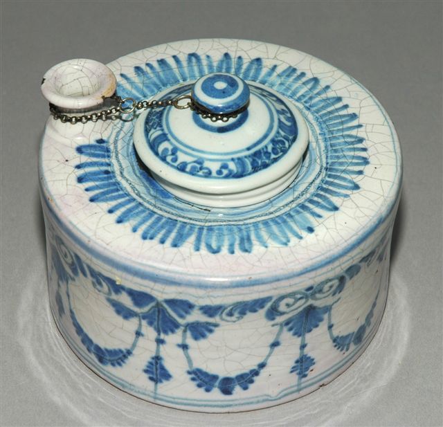 ENCRIER cylindrique en faïence de TOULOUSE qui porte en son centre un godet avec bouchon retenu par petite chaînette en argent au col du pique plume. Le décor à la Berain est en camaïeu de bleu.