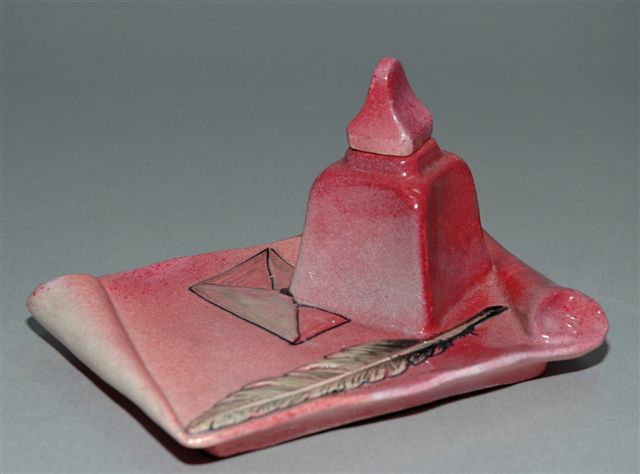 ENCRIER forme de flacon pyramidal tronqué à bouchon pyramidion sur base représentant une feuille de papier à lettre parcheminée aux extrémités enroulées avec pour motifs en barbotine les symboles de l'écriture par la plume d'oie et l'enveloppe. Le coloris est rose et ocre brun.