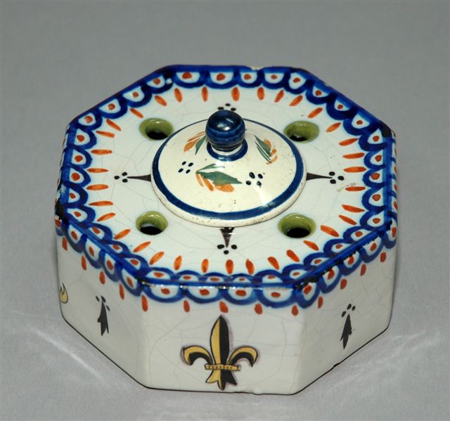 ENCRIER de forme octogonale pour un godet encadré de quatre trous pique plume. Le décor en polychromie porte des motifs de Quimper avec fleur de lis, mouchetures d'hermine et armoiries.