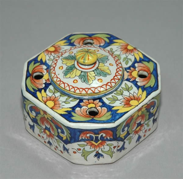 ENCRIER de forme octogonal pour un godet couvert à prise bouton et quatre trous pique plume. Décor de Rouen aux lambrequins en polychromie de DESVRES.