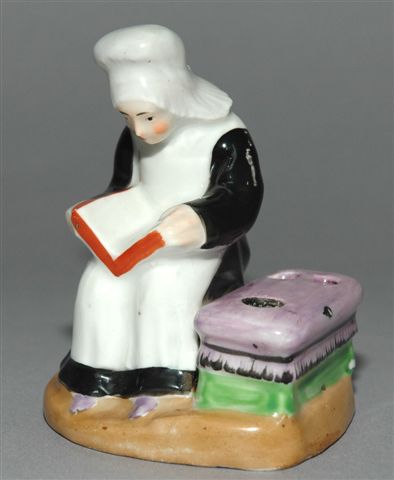 ENCRIER en porcelaine de PARIS, série polychrome des personnages: ici une béguine en lecture, assise sur un tabouret.