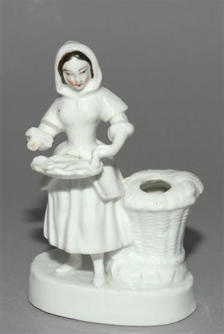 ENCRIER en porcelaine de PARIS, série blanc et or des petits métiers: ici une poissonnière vendant sa marchandise. (manque une main).