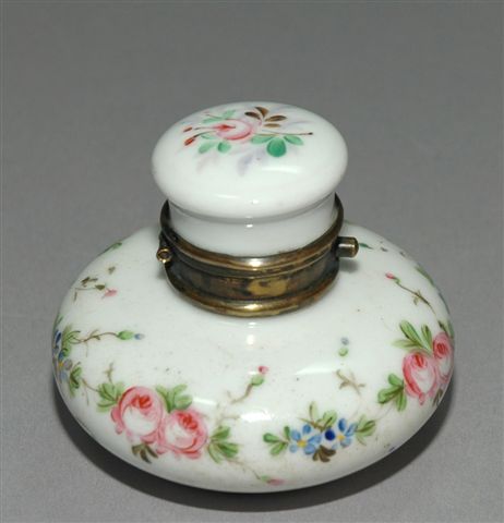 ENCRIER en porcelaine de PARIS, forme petit flacon avec bouchon charnière laiton avec fermoir, décor floral.