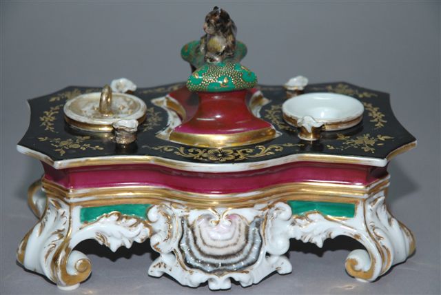 ÉCRITOIRE en porcelaine de PARIS, d'après JACOB PETIT forme table bureau sur quatre pieds volutes de feuilles d'acanthe. Le plateau reçoit deux godets encriers et quatre trous pique plume de chaque côté d'un réceptacle central dont le couvercle représente un chat couché sur un coussin brodé. Décor polychrome typique de ses productions très colorées et surchargées.