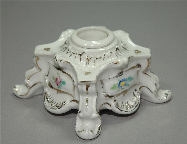ENCRIER en porcelaine de PARIS, de forme cubique sur quatre pieds volutes, pour un godet encrier. Décor à motifs de fleurs et de dorures.