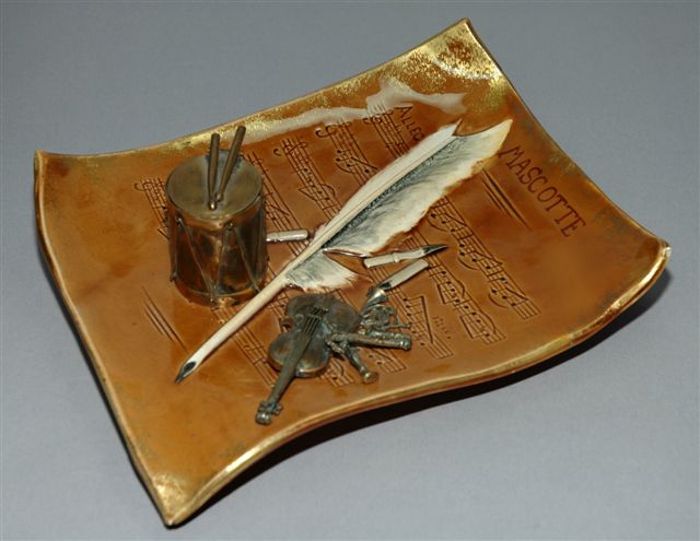 ENCRIER sur un plateau plumier rectangulaire aux angles cornés de la forme d'un feuillet de partition musicale au titre " La Mascotte ". Le décor se complète par une plume d'oie et deux embouts de plume et plusieurs instruments (violon, cor, flûte saxo et un tambour qui recèle le godet encrier en cristal.