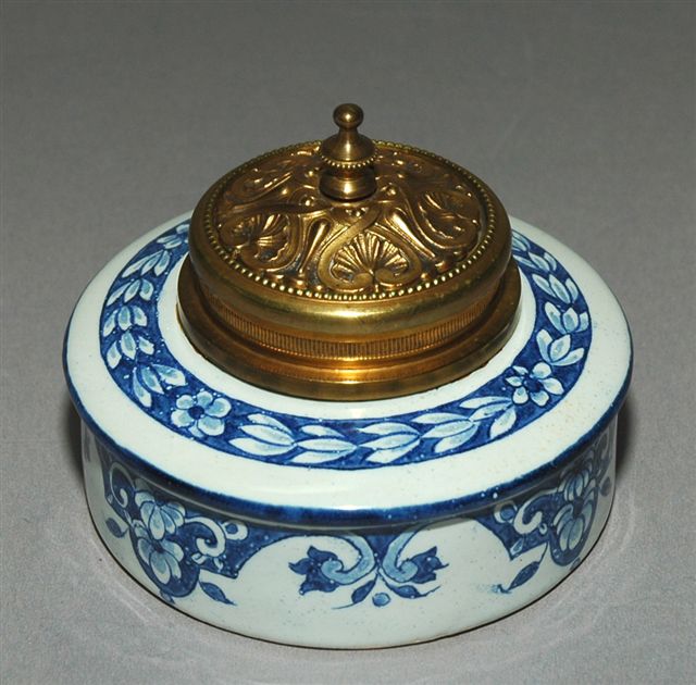 ENCRIER cylindrique en faïence pour un godet en cristal dont le couvercle en bronze doré a sa base sertie sur le corps. Il est à décor de lambrequins, d'une fleur de lis et de feuillages traitée en camaïeu de bleu sur couverte blanche.