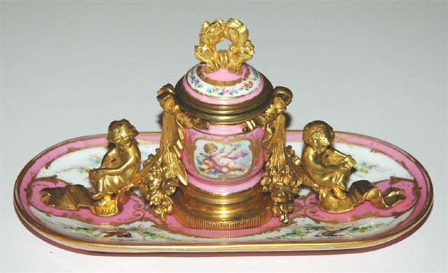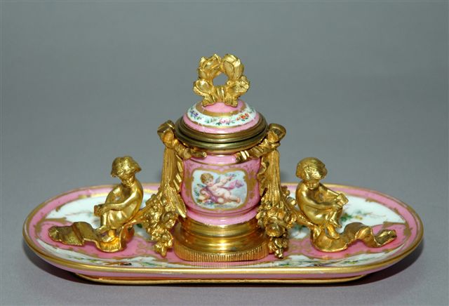 ENCRIER en porcelaine au coloris pastel à dominante rose fait d'un petit plateau ovale à décor d'oiseaux sur des branchages. Le porte godet encrier central est enchâssé dans un support en bronze doré à l'or fin constitué de deux puttis assis sur le drapé tombant du haut de la structure entre des grappes de fleurs. La fermeture est assurée par un couvercle charnière avec prise en couronne tressée surmontant un petit dôme en porcelaine. Sur les deux petits médaillons qui ornent les flancs de l'encrier deux miniatures représentent l'une un petit Amour et l'autre un bouquet de fleurs. (Bouchon de porcelaine recollé).