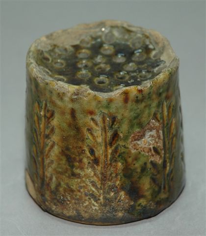 POUDREUR à sable pour le séchage de l'encre ayant fait partie d'une écritoire du XVIIIème siècle. Le décor de rameaux en creux sur un émaillage vert ombré.