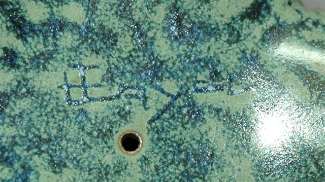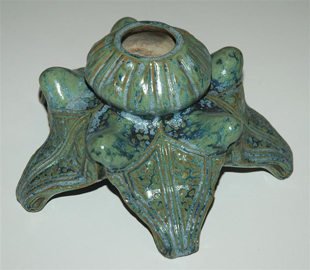 ENCRIER Art Nouveau forme d'une fleur de nénuphar à couverte irisée bleue et verte pour un godet en son centre. (manque bouchon).