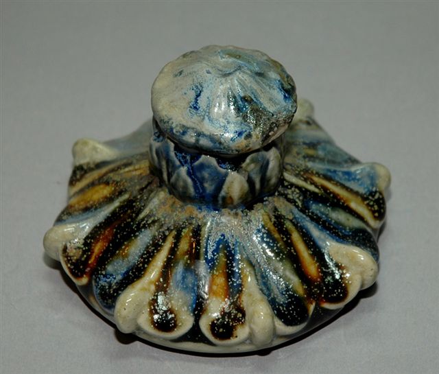 ENCRIER Art Nouveau en grès forme flacon pour un godet avec bouchon, au centre d'un décor floral à émaillage gris bleu et ocre. (égrenures).
